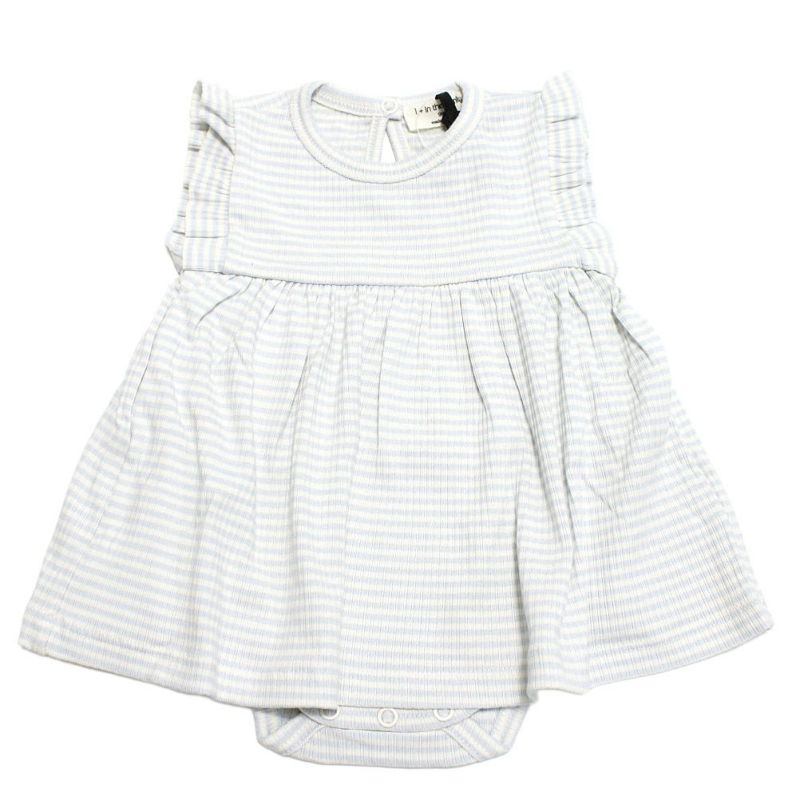 ナチュラルで柔らかい印象のボーダー柄ロンパース。