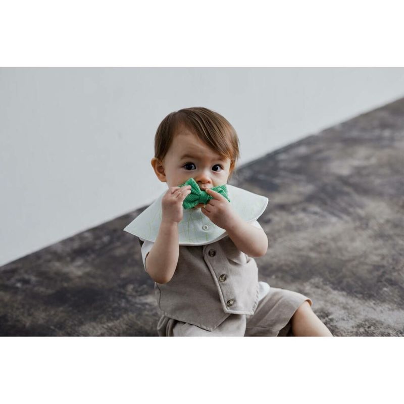 大人がスタイを使ってあやすうちに子どもが見て、音を聞き、使い方を理解しておもちゃで遊べるようになる成長の過程を思い描きながらできあがったデザインです。