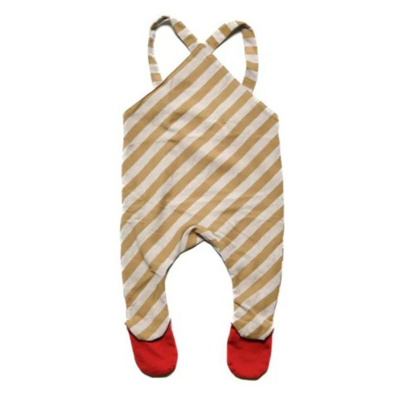 斜めストライプの足カバー付きロンパース。