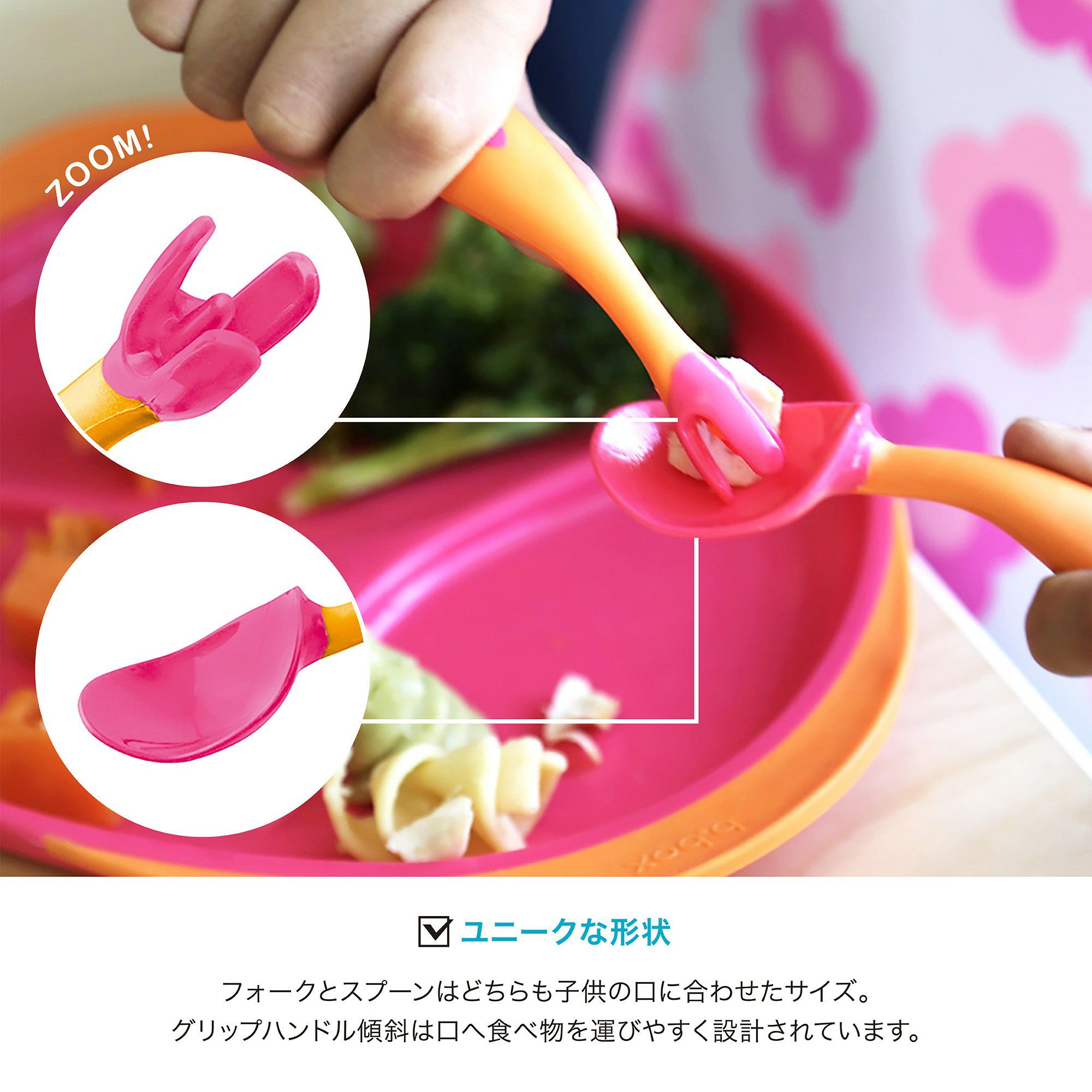 グリップハンドル傾斜は口へ食べ物を運びやすく設計。