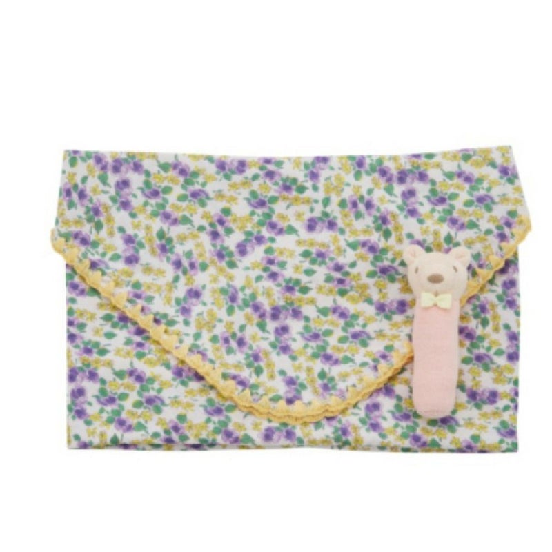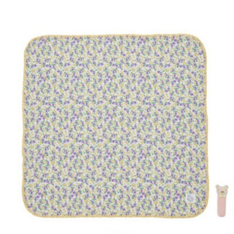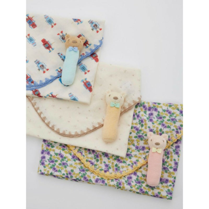 総柄WガーゼのブランケットとクマのスティックラトルのギフトBOXセット。