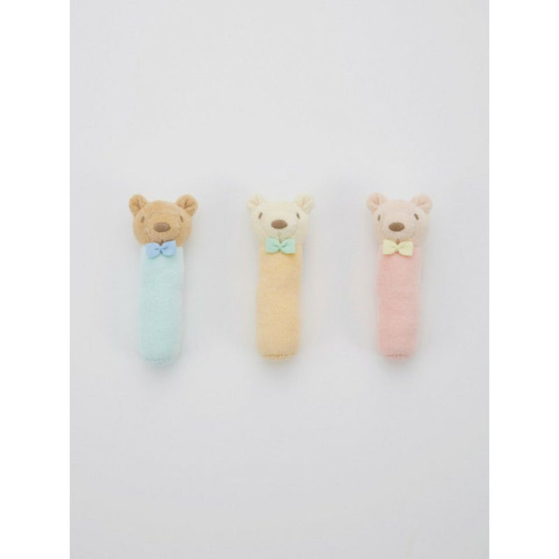 ラトルには振ると優しく鳴る鈴と、握るとキュッと音がする鳴き笛が入っています。