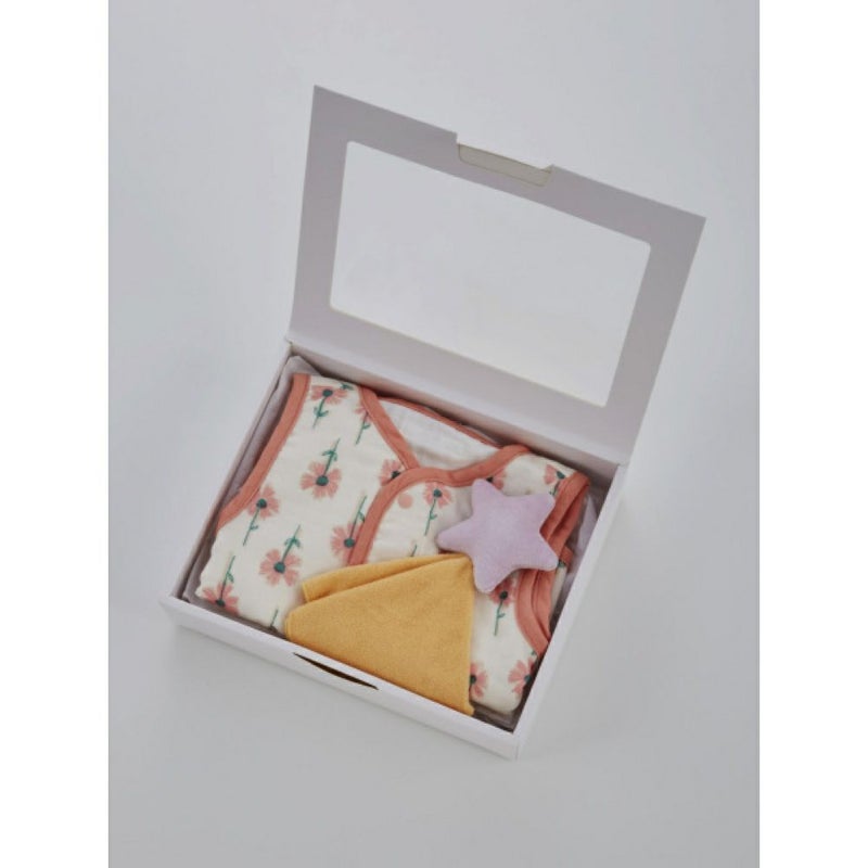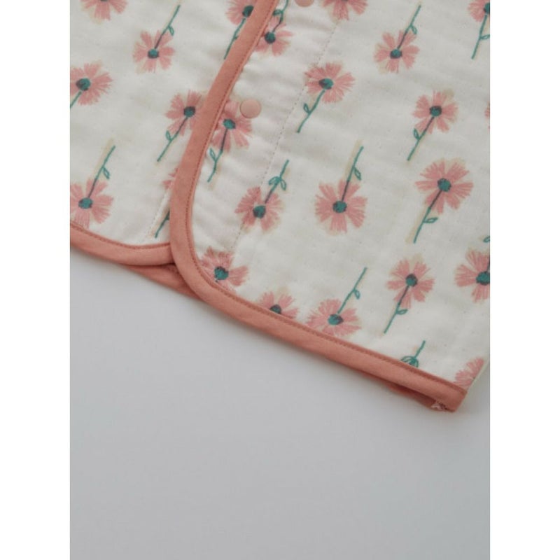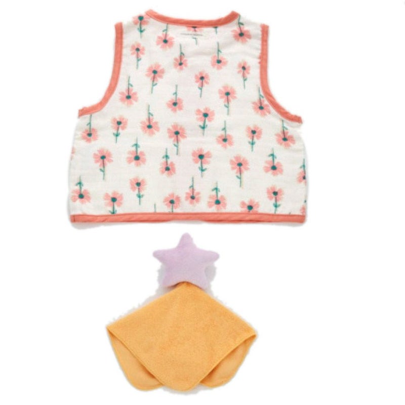 ・4重ガーゼ素材の総柄ベビーベストと星のハンカチラトルのセット。