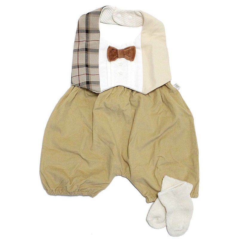 3種類の生地を使ったスタイにはパイル地の蝶ネクタイをセット。