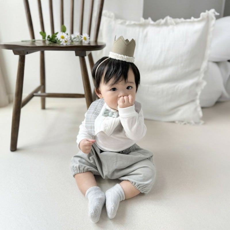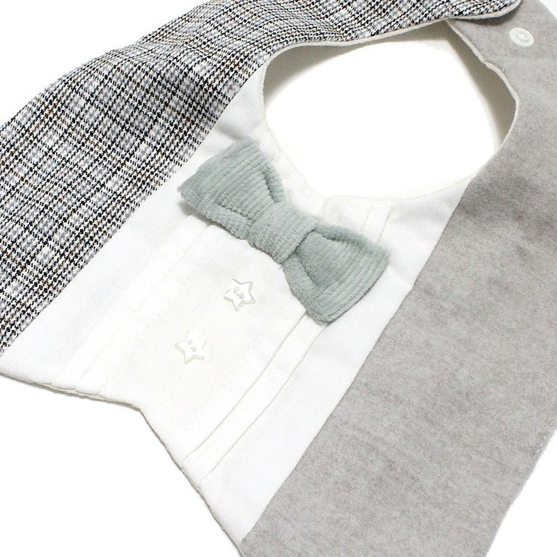 3種類の生地を使ったスタイにはパイル地の蝶ネクタイをセット。