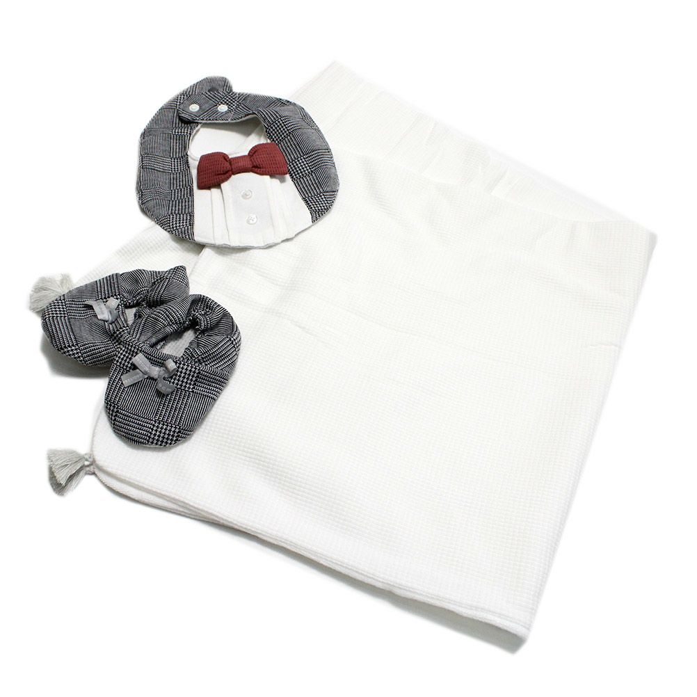 フォーマルチックなスタイとベビーシューズ、おくるみの3点セット。