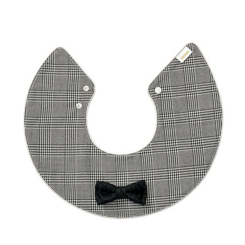 洗練されたモノトーンのスタイは、取り外し可能な蝶ネクタイ付き。