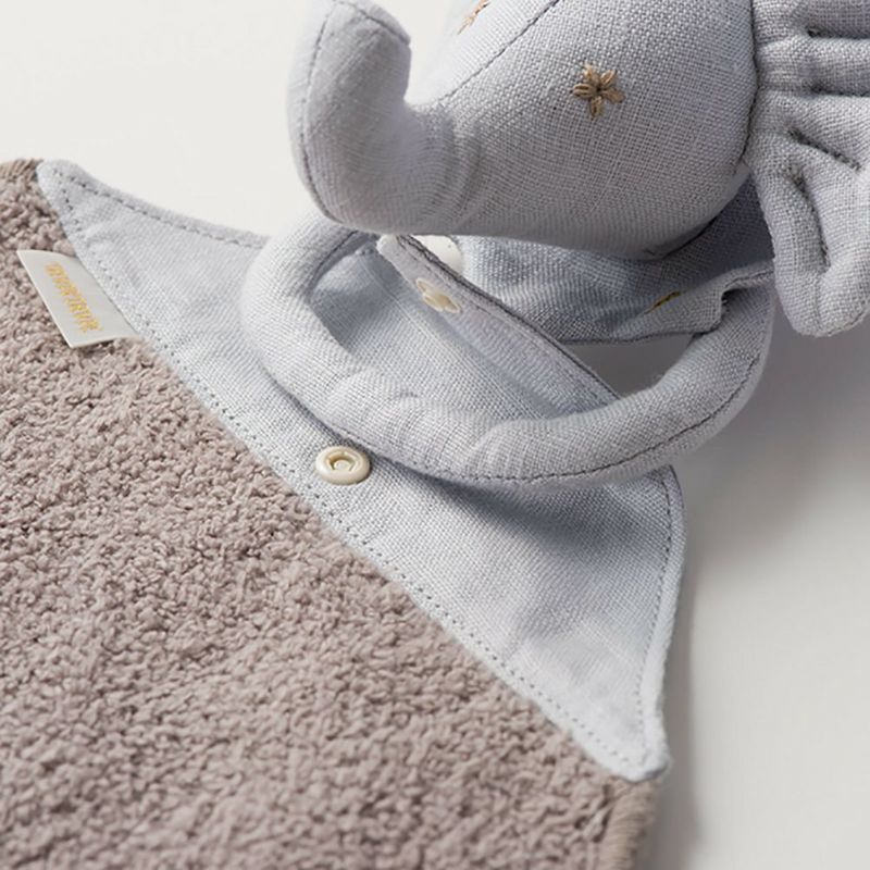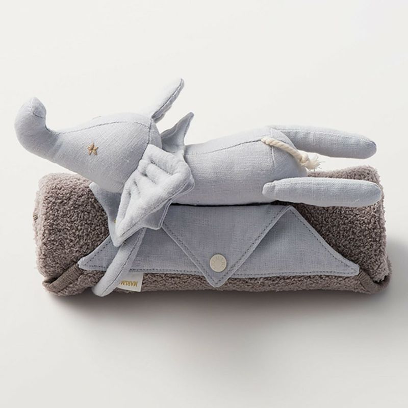 お昼寝に便利なブランケットと、鈴入りのぞうのぬいぐるみは成長を長く見守るアイテム。