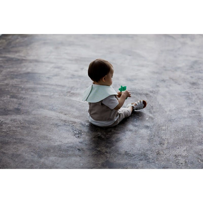 大人がスタイを使ってあやすうちに子どもが見て、音を聞き、使い方を理解しておもちゃで遊べるようになる成長の過程を思い描きながらできあがったデザインです。