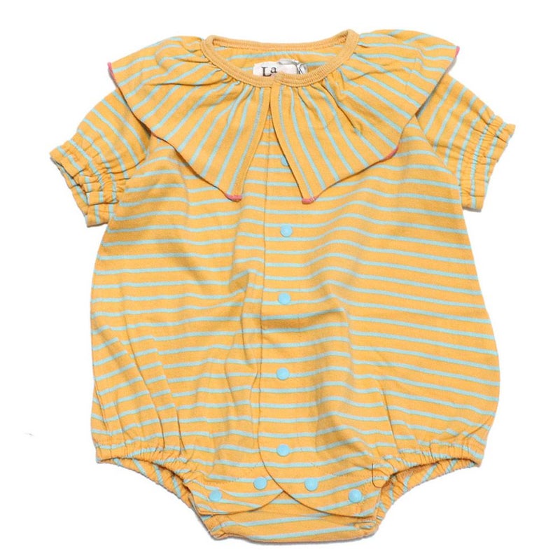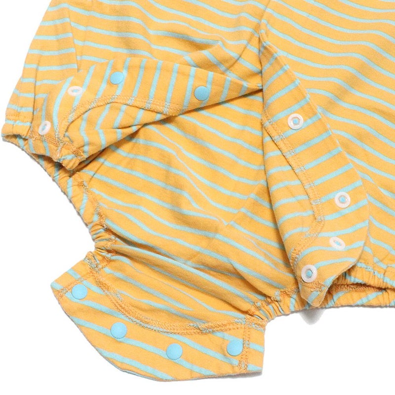 ボーダー柄がインパクト抜群のロンパース。