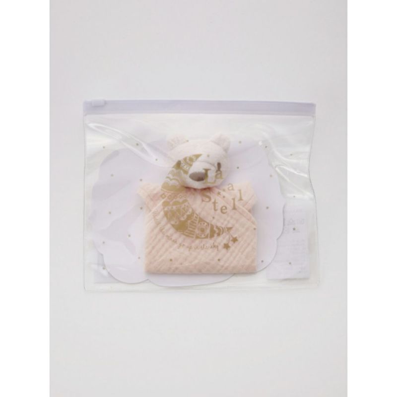 クマのラトルがついたハンカチ。