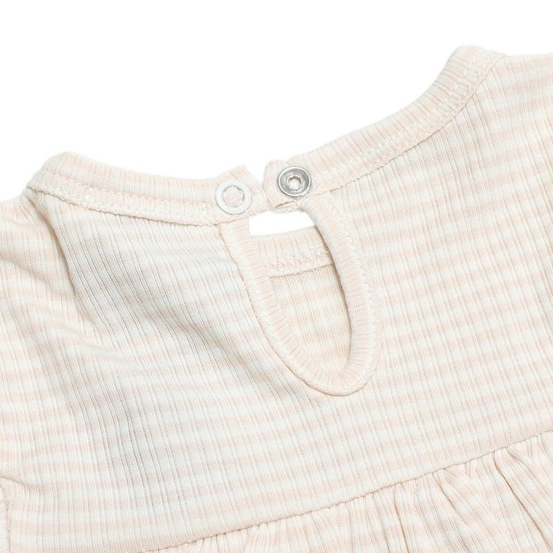 ナチュラルで柔らかい印象のボーダー柄ロンパース。