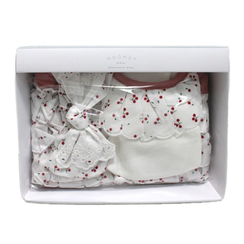 ヘアバンド、スタイ、ブルマをボックスに入れたギフトセット。