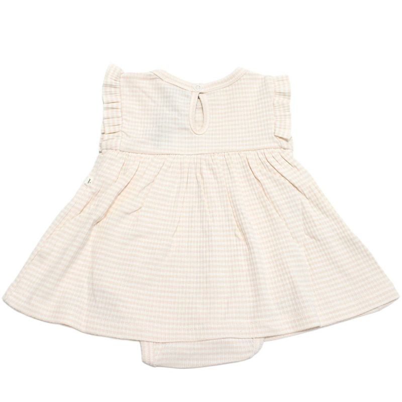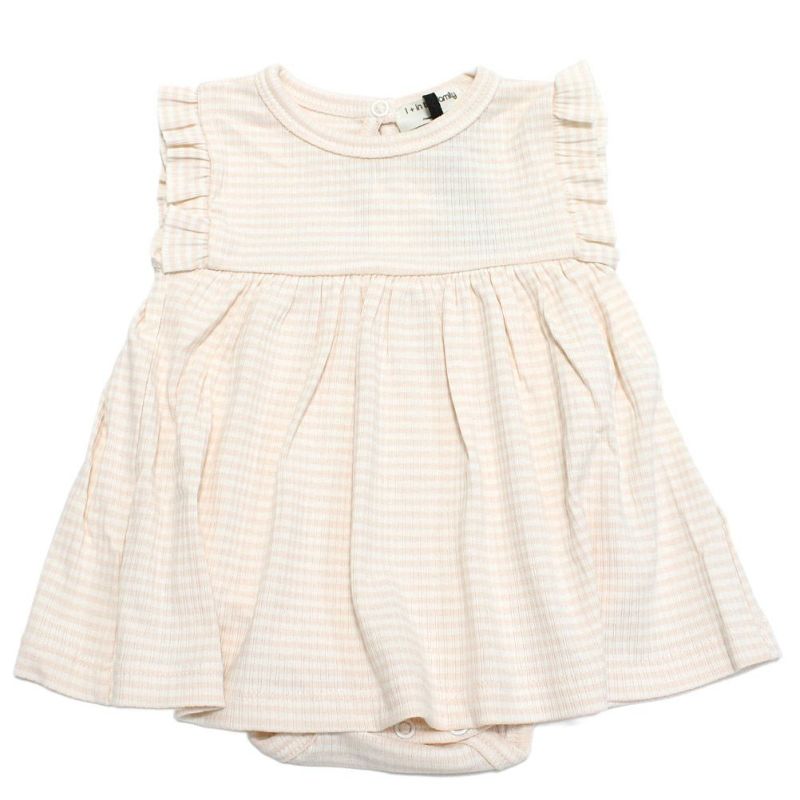 ナチュラルで柔らかい印象のボーダー柄ロンパース。