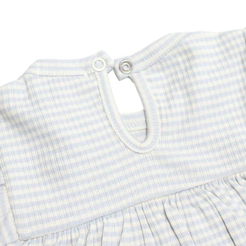 ナチュラルで柔らかい印象のボーダー柄ロンパース。
