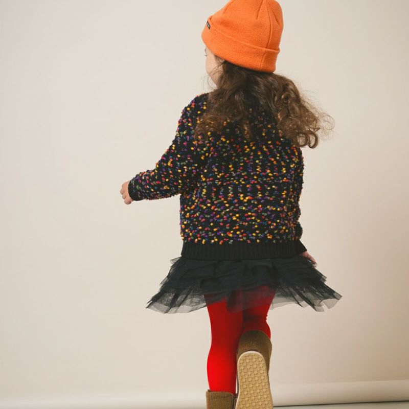 カラフルなポコポコを編みこんだニットカーディガン。