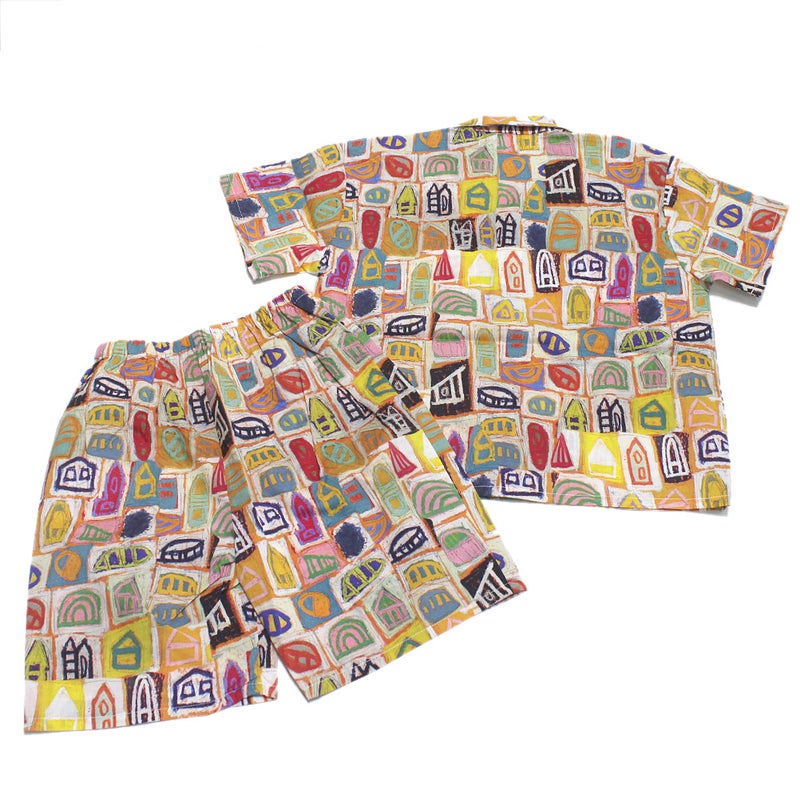 カラフルな総柄が目を引くセットアップ。