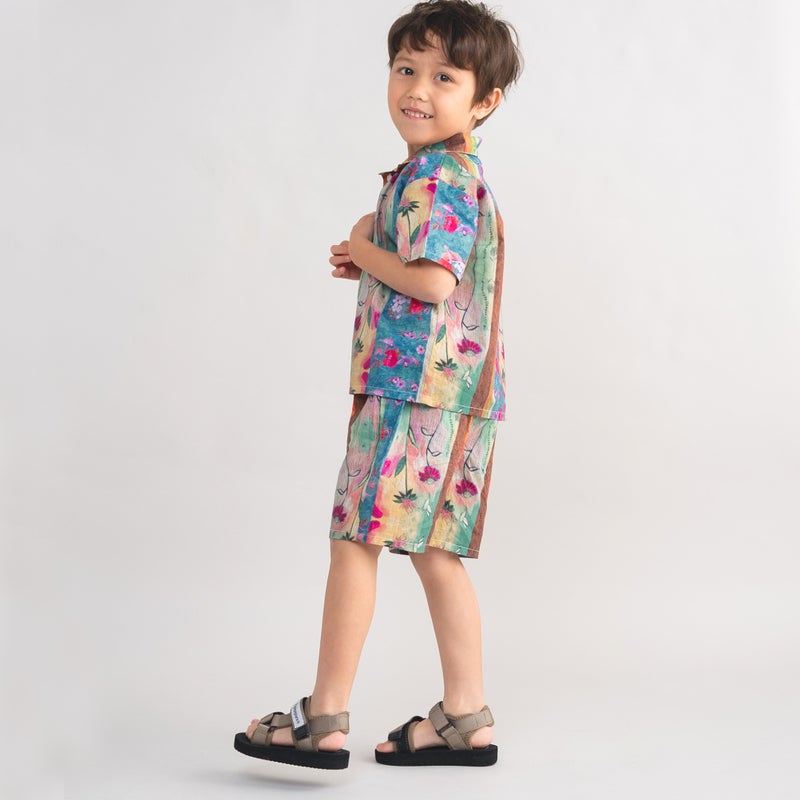 カラフルな総柄が目を引くセットアップ。