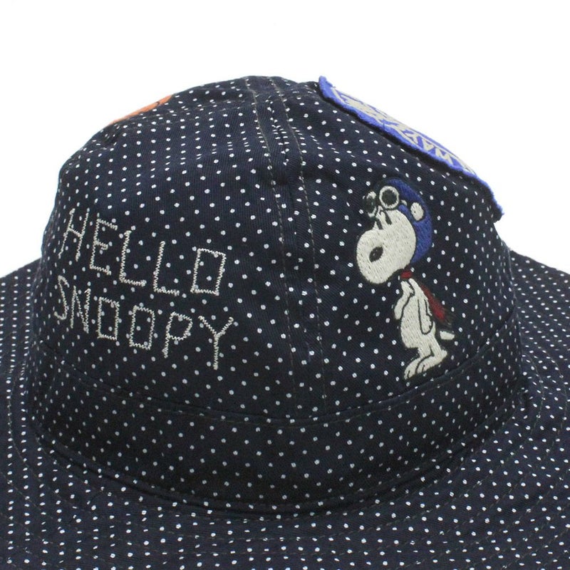 手振りミシンの雰囲気のスヌーピー刺繍と、ワッペンが全体に入ったコラボハット。