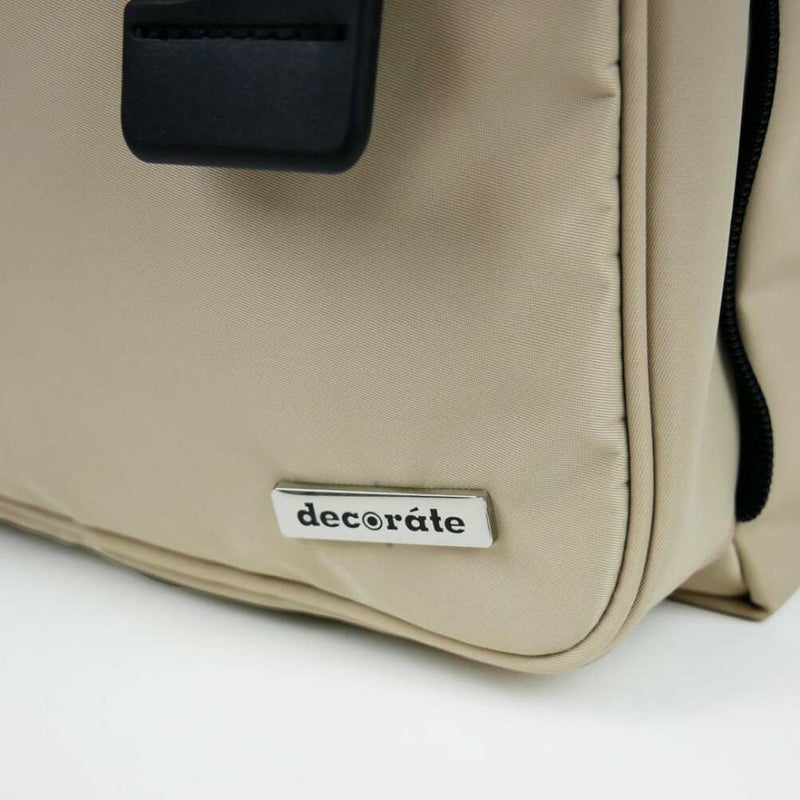 外側ポケットに装着したブランドネームのプレートはメタル製で、ちょっぴりリッチな演出も。