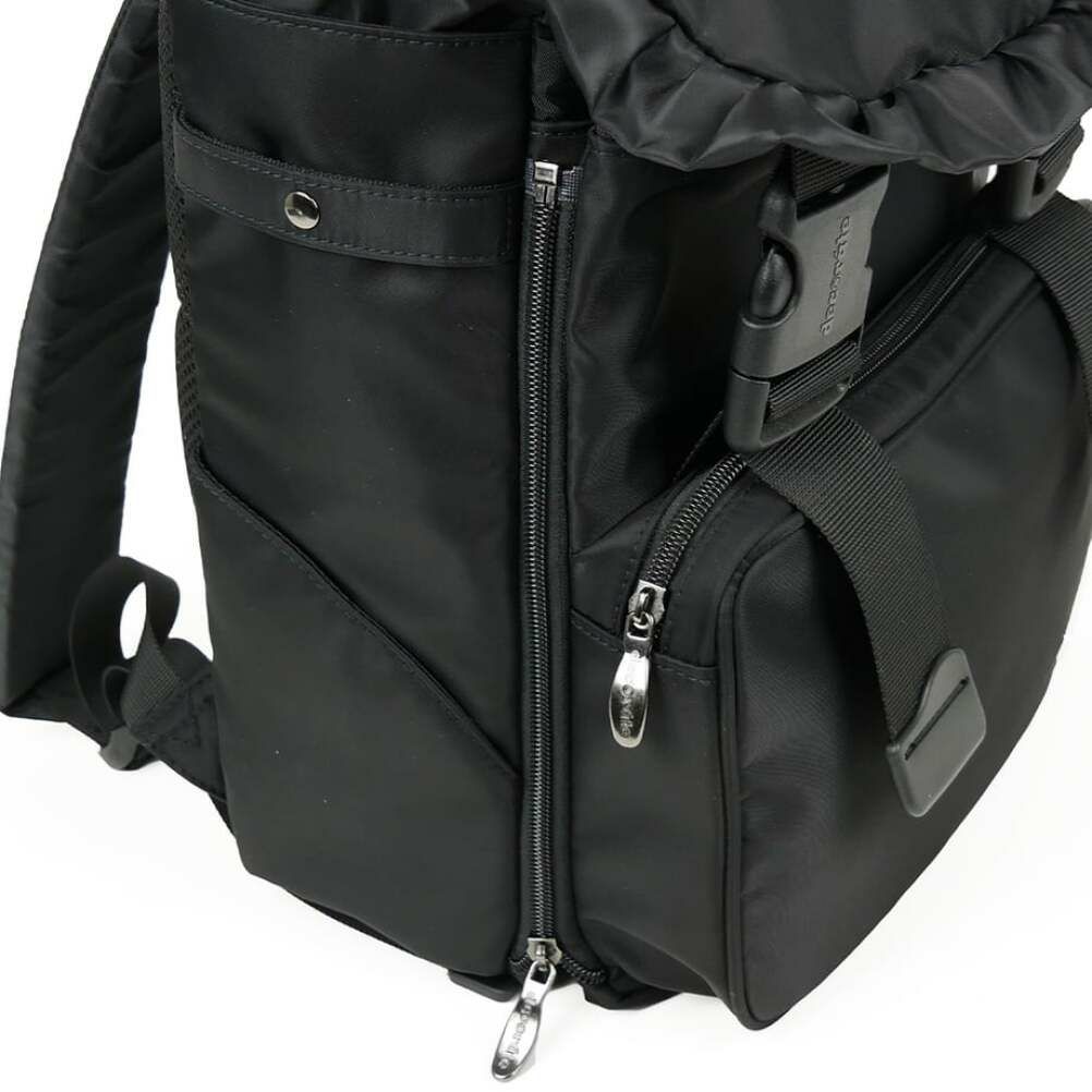 サイドのファスナーでサブコンパートメントの容量を調整可能。