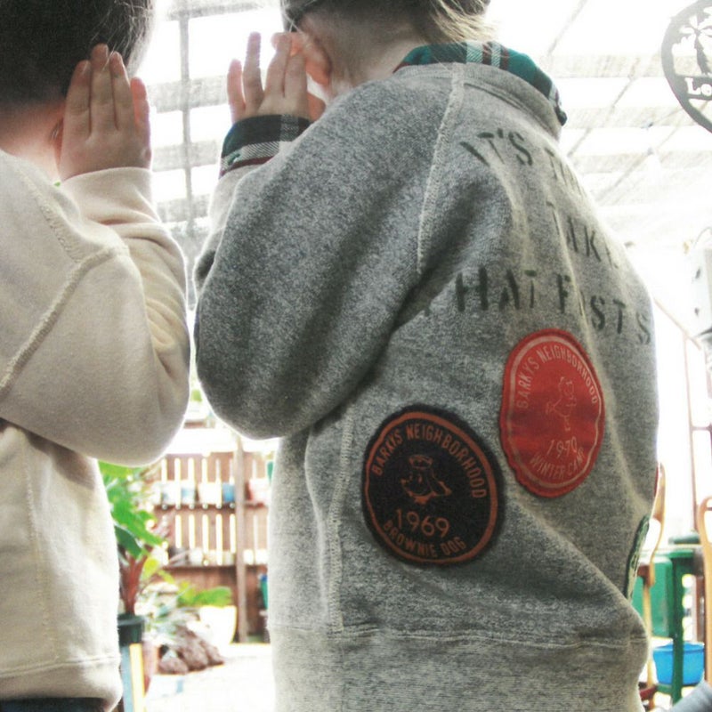 存在感のあるワッペンを背面にとりつけたスウェットプルオーバー。
