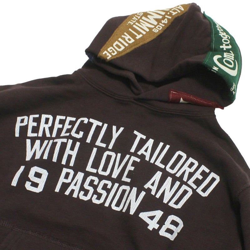 フード周りにお気に入りのペナントを付けたリメイク風パーカーです。