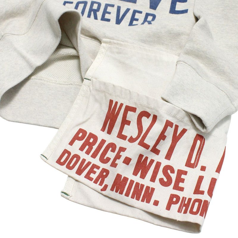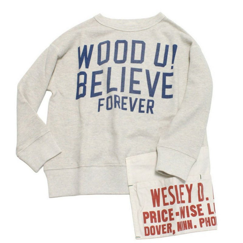 エプロンのポケットをスウェットにとりつけたリメイク風デザイン。