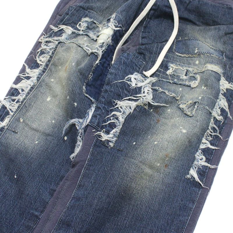 本格的なダメージ加工を施したデニムと、スウェットパンツをドッキング。