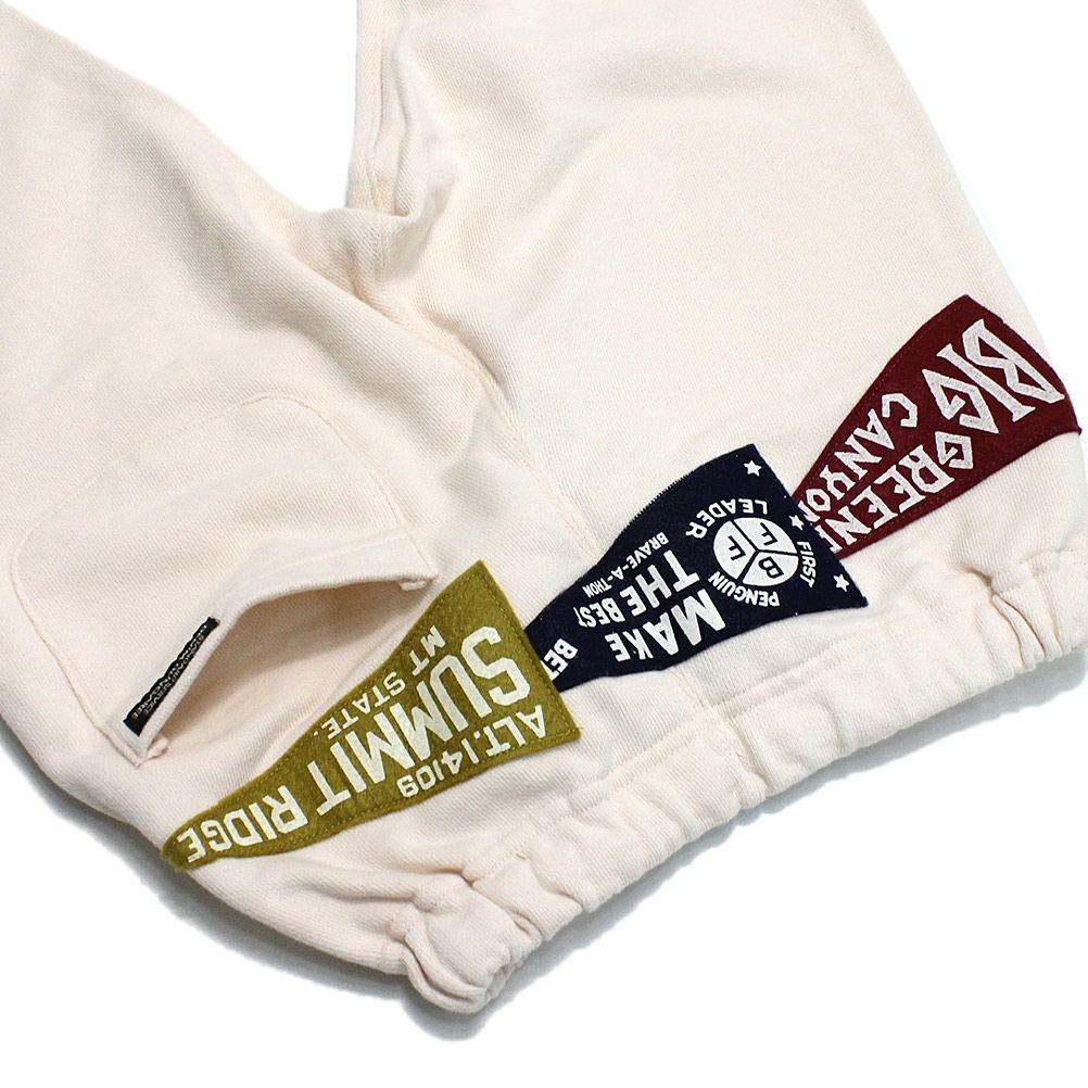 ヒップに取り付けたペナントが目を惹くスウェットパンツ。