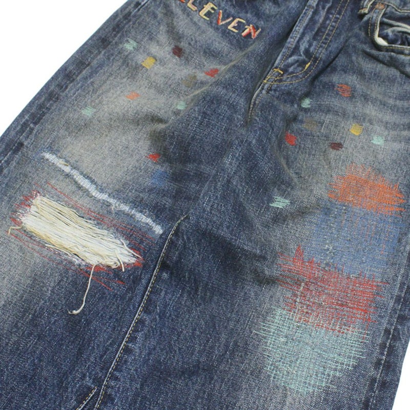 前にカラフルな糸でリメイク風の刺繍を施した雰囲気のあるデザイン。