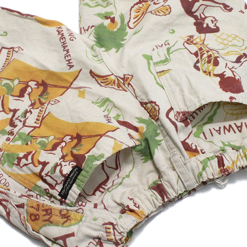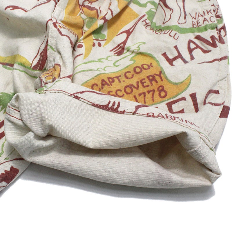 1950年代のハワイの地図をパネル柄にしたワイドシルエットのショートパンツ。
