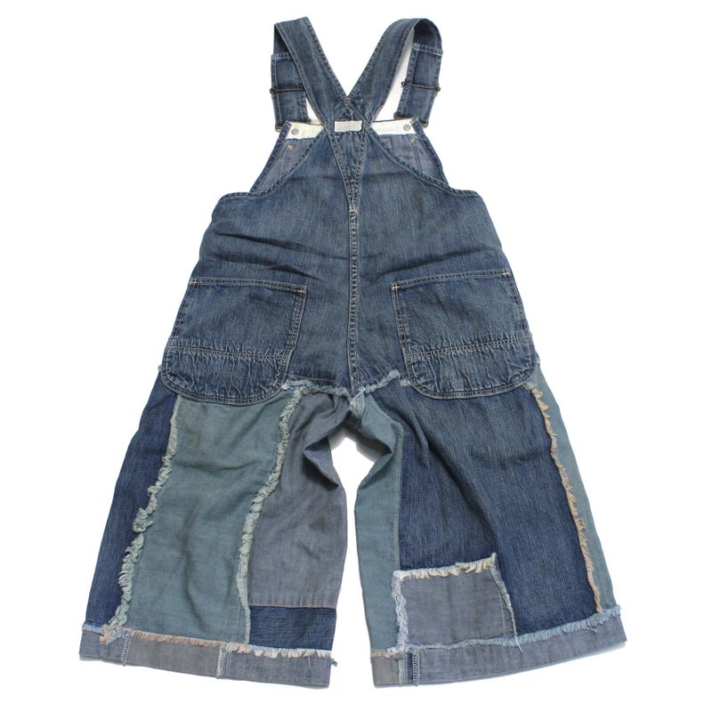 様々な生地(ジンバブエデニム、シャンブレー、8ozデニム)を用いて作られたパッチワークの8分丈オーバーオール。