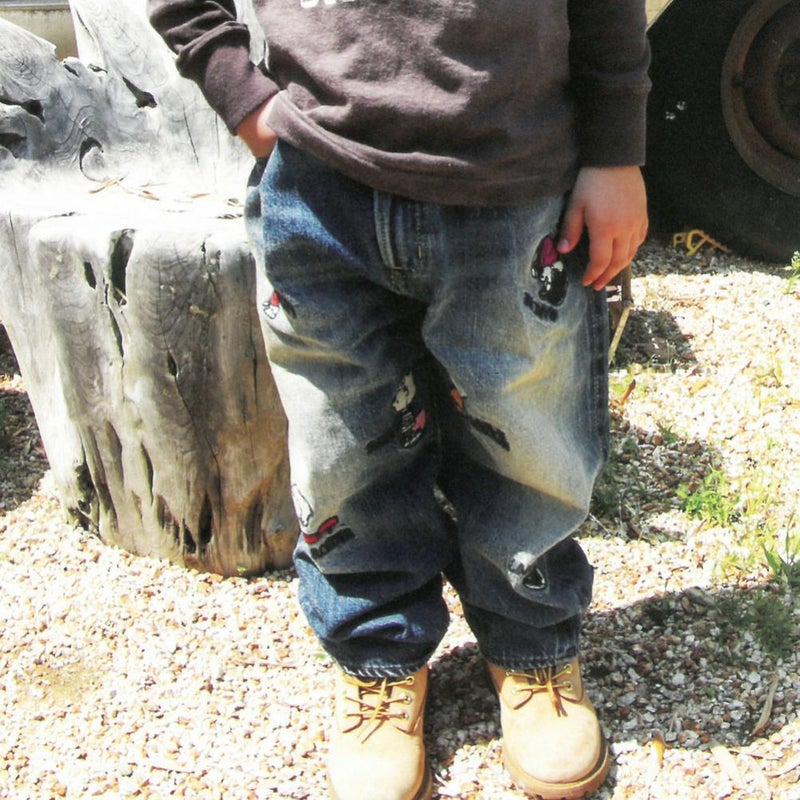 海外の壁画アートのようなスタイリッシュさとストリートを感じさせるPEANUTSメンバーを刺繍したデニムパンツ。