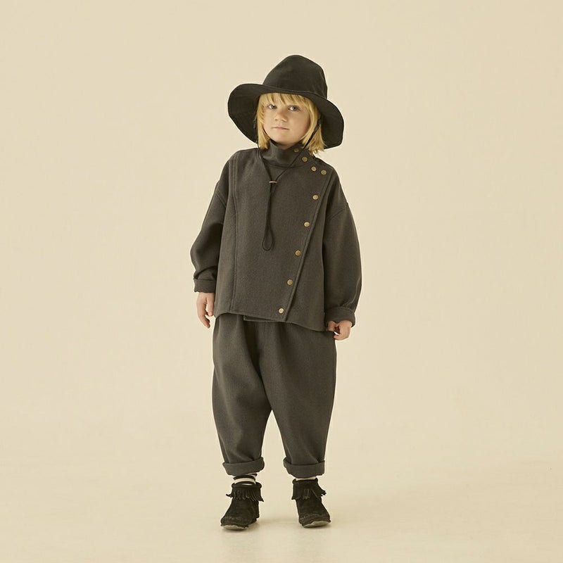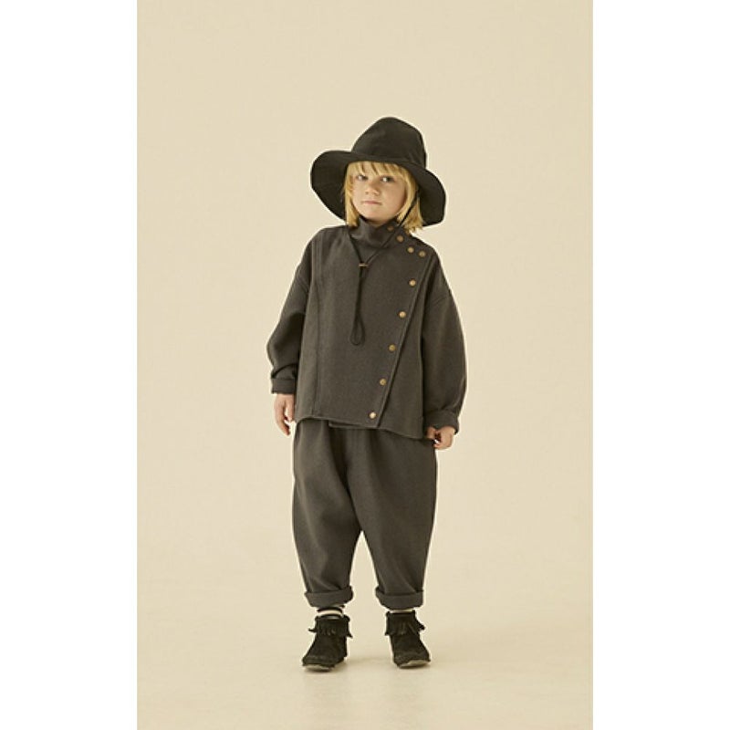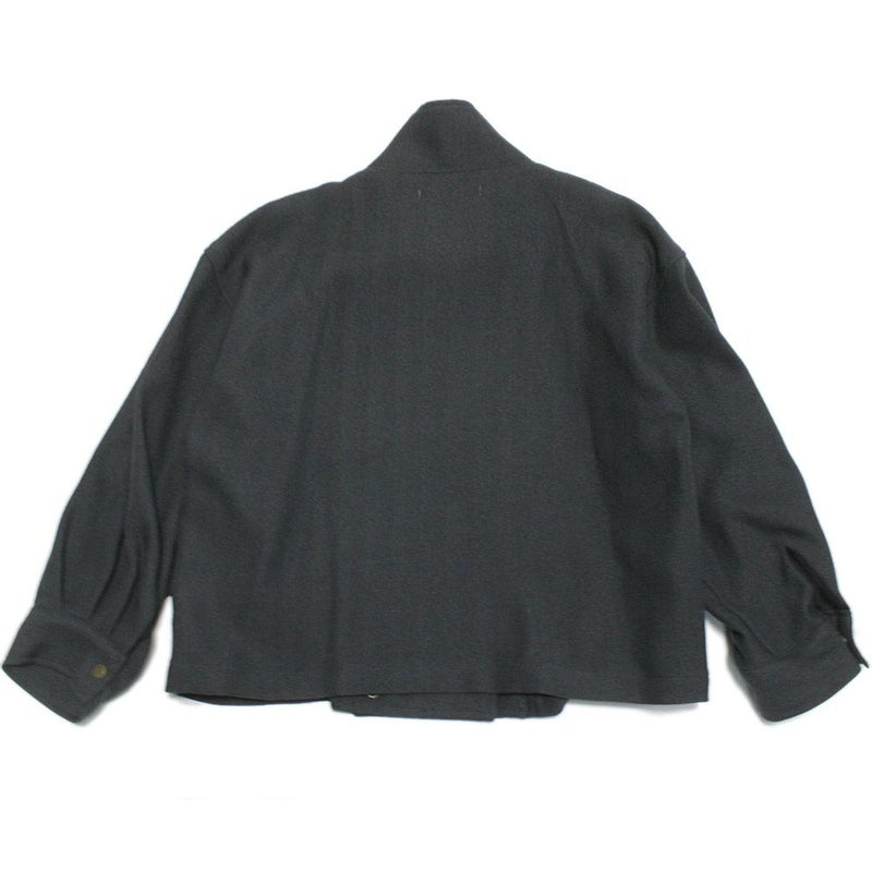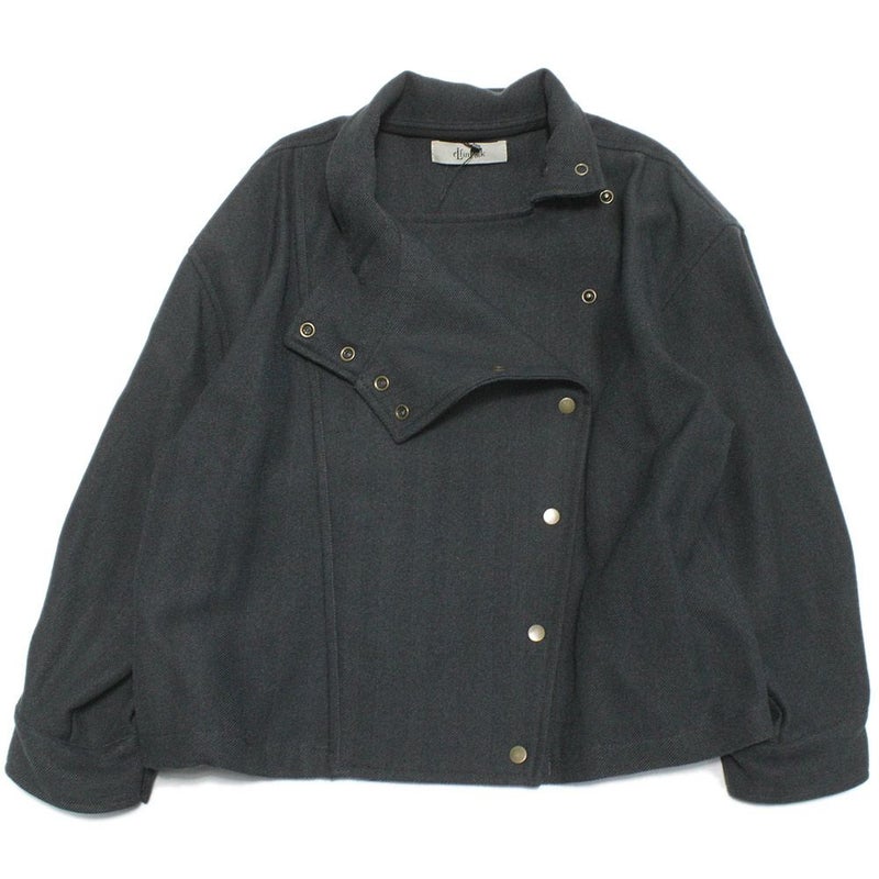 アシンメトリーなフロントデザインのハイネックジャケット。
