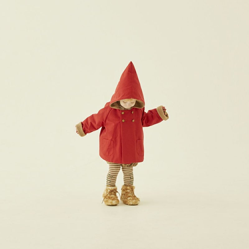 定番のとんがりフードとAラインシルエット、オリジナルのeLf釦が妖精王国の証のこびとコート“eLf coat”。