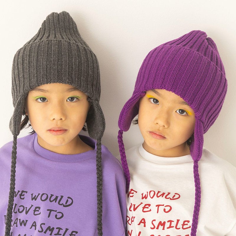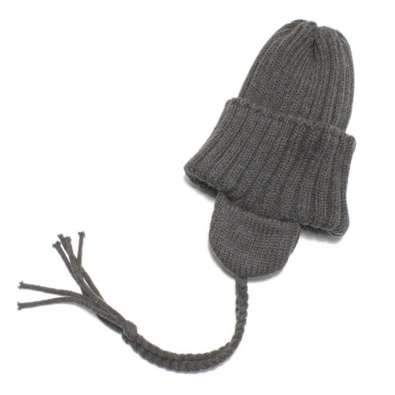 伸縮性があり柔らかく、軽い糸で編まれた耳当て付きニット帽。