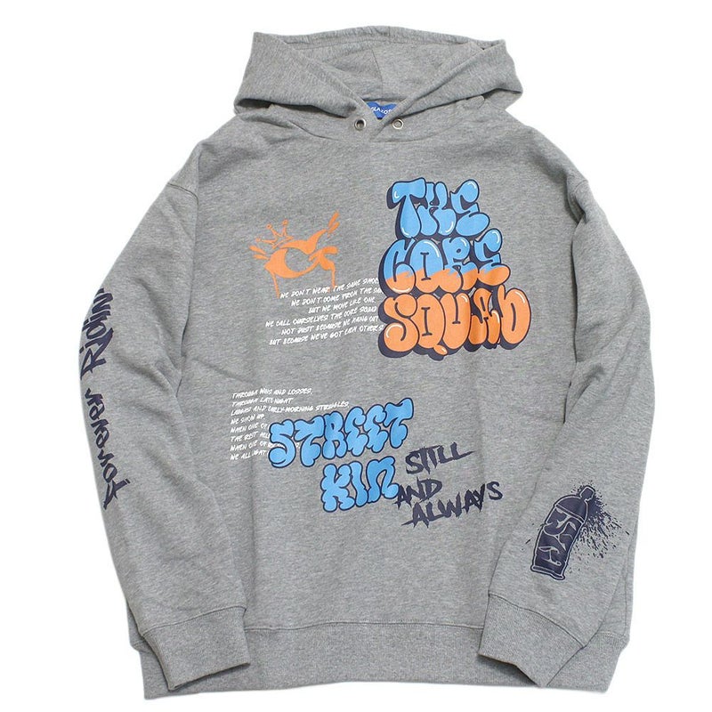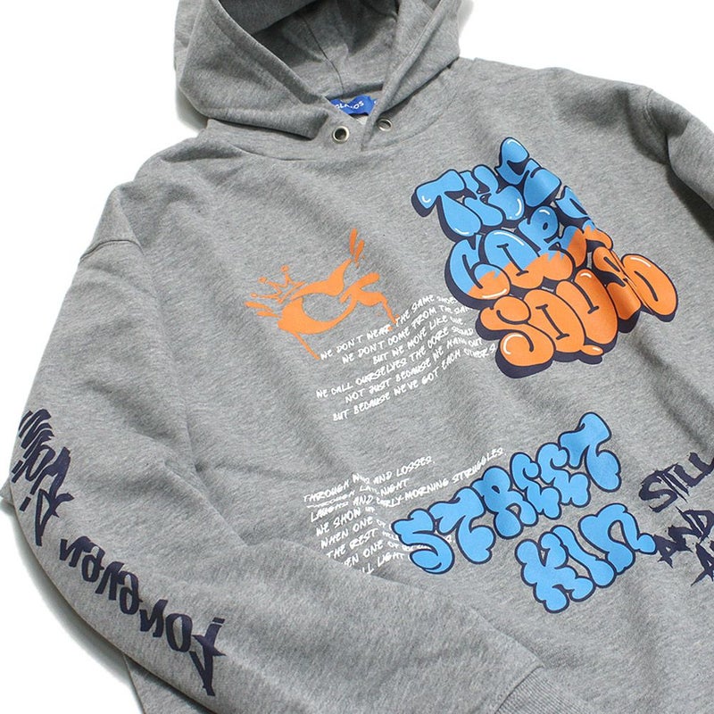 ストリート感のあるさまざまなグラフィックがレイアウトされたスウェットパーカー。