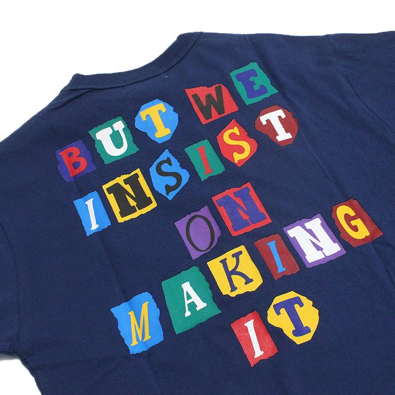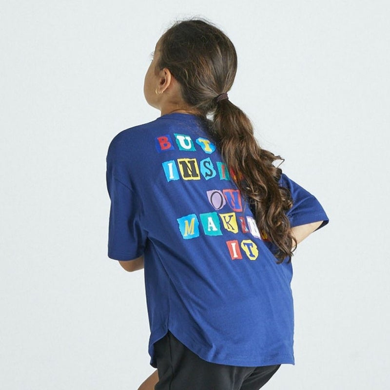 バックスタイルが印象的なメッセージTシャツ。