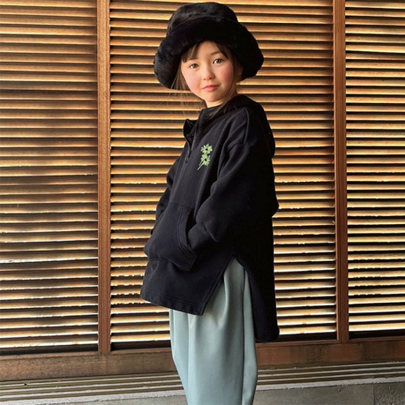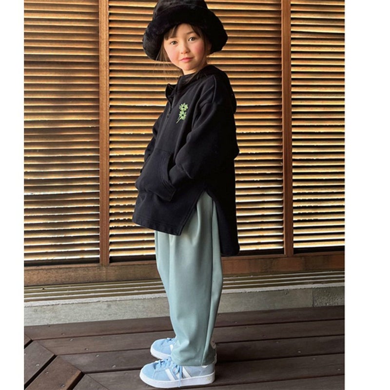 脇に入ったざっくり長いスリットから、ボトムスのレイヤードを見せることで、大きくてもすっきりとしたレイヤードスタイルをつくることができます。