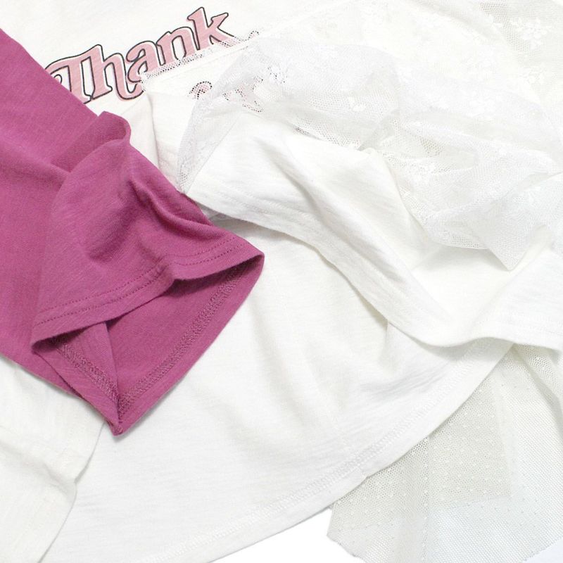 バンドTのようなプリントとラグラン配色が特徴。