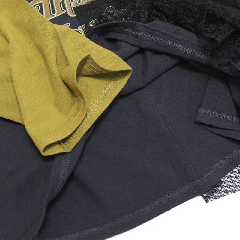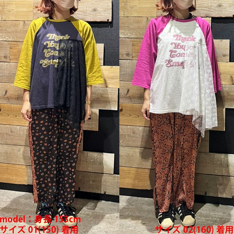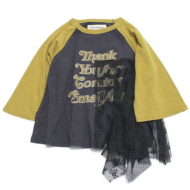 バンドTのようなプリントとラグラン配色が特徴。