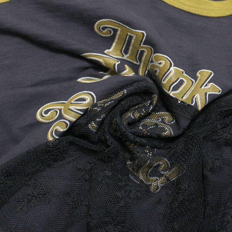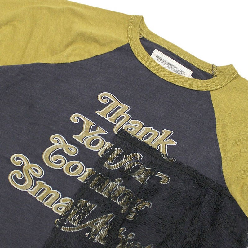 バンドTのようなプリントとラグラン配色が特徴。