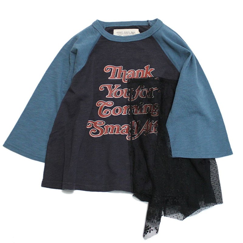 バンドTのようなプリントとラグラン配色が特徴。