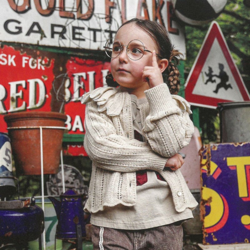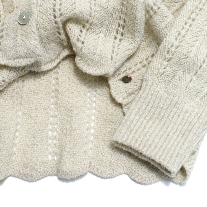フリフリの衿に衿端のラメがアクセントとなった、透かし編みのニットカーディガン。