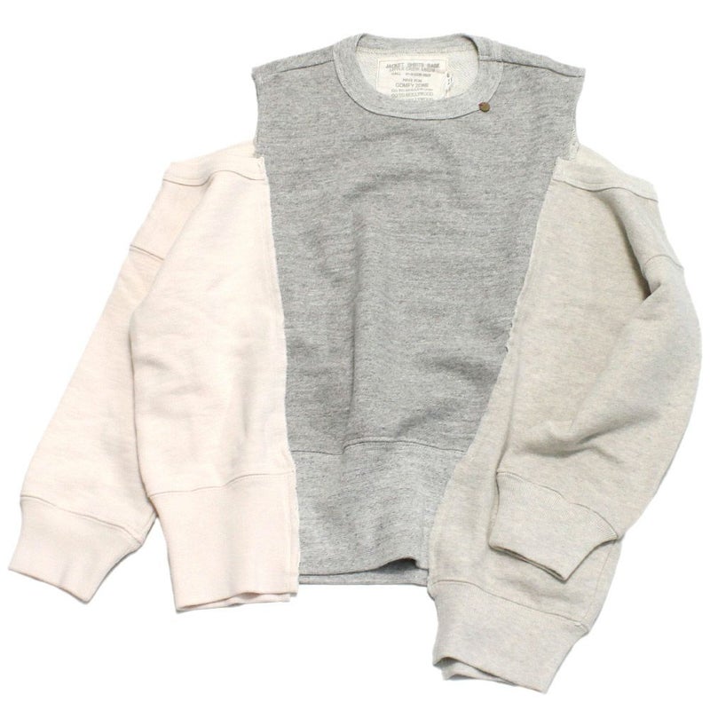 クルーネックのスウェットを3枚リメイクしてドッキングさせたデザインが個性的。