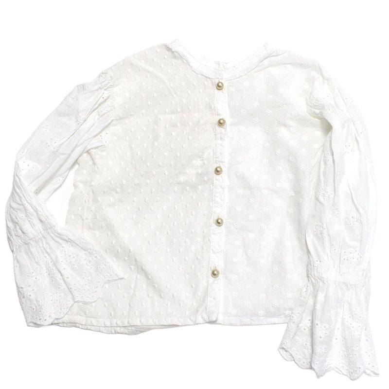 ドットの刺繍に、花柄のカットワークとパーツごとに異なる生地を使ったドッキングデザインのブラウス。