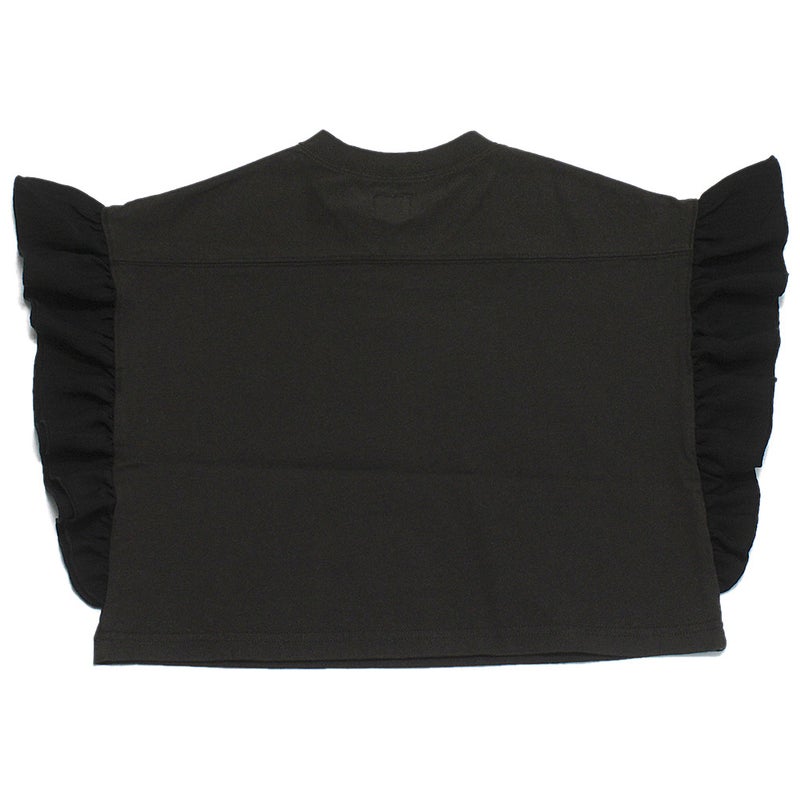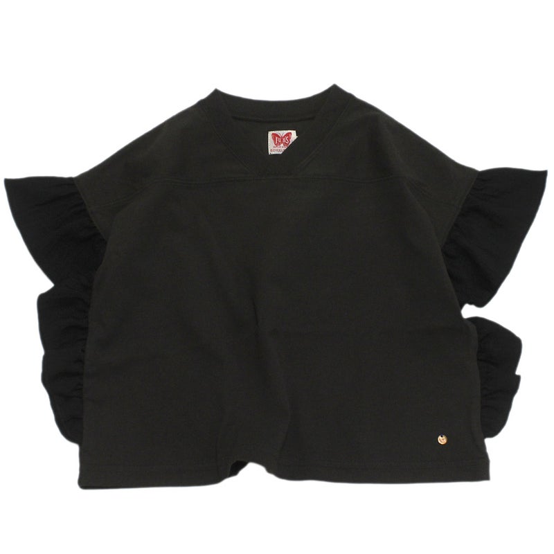 VネックのフットボールTの袖にフリルをあしらったTシャツ。