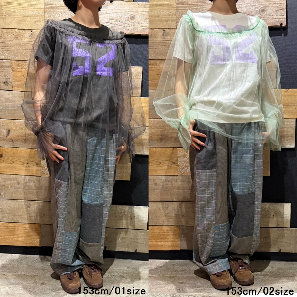 ナンバリングTシャツにふわっとシアーなトップスを重ねたセットアイテム。チュールトップスとのレイヤードでこなれ感を演出♪