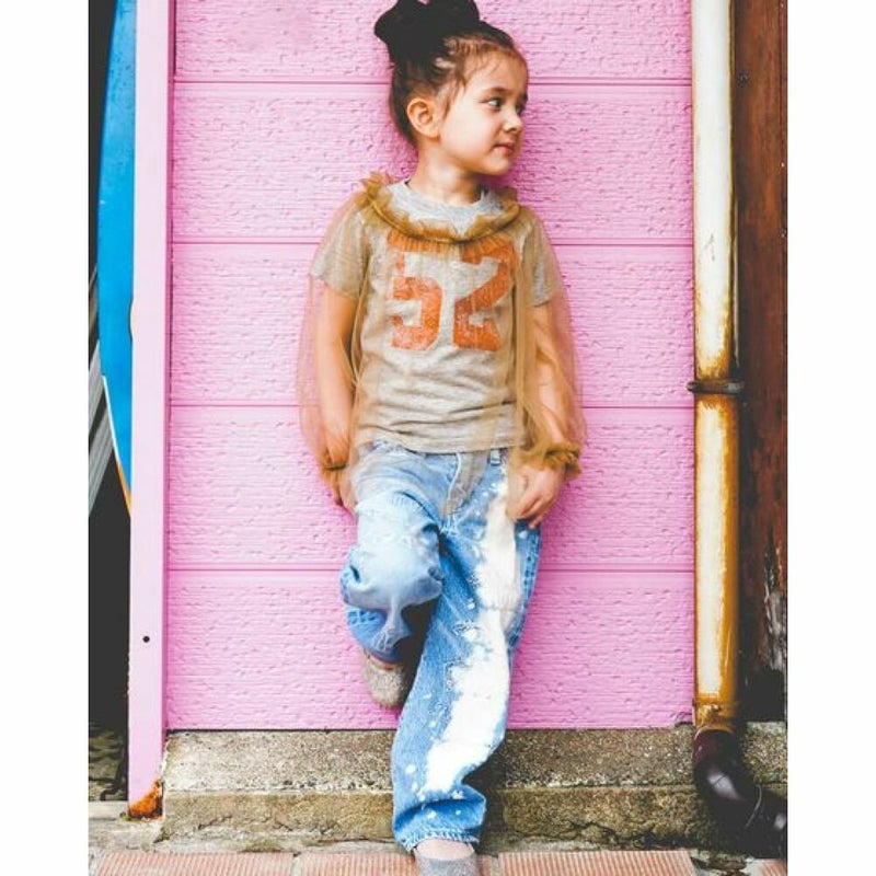 ナンバリングTシャツにふわっとシアーなトップスを重ねたセットアイテム。チュールトップスとのレイヤードでこなれ感を演出♪
